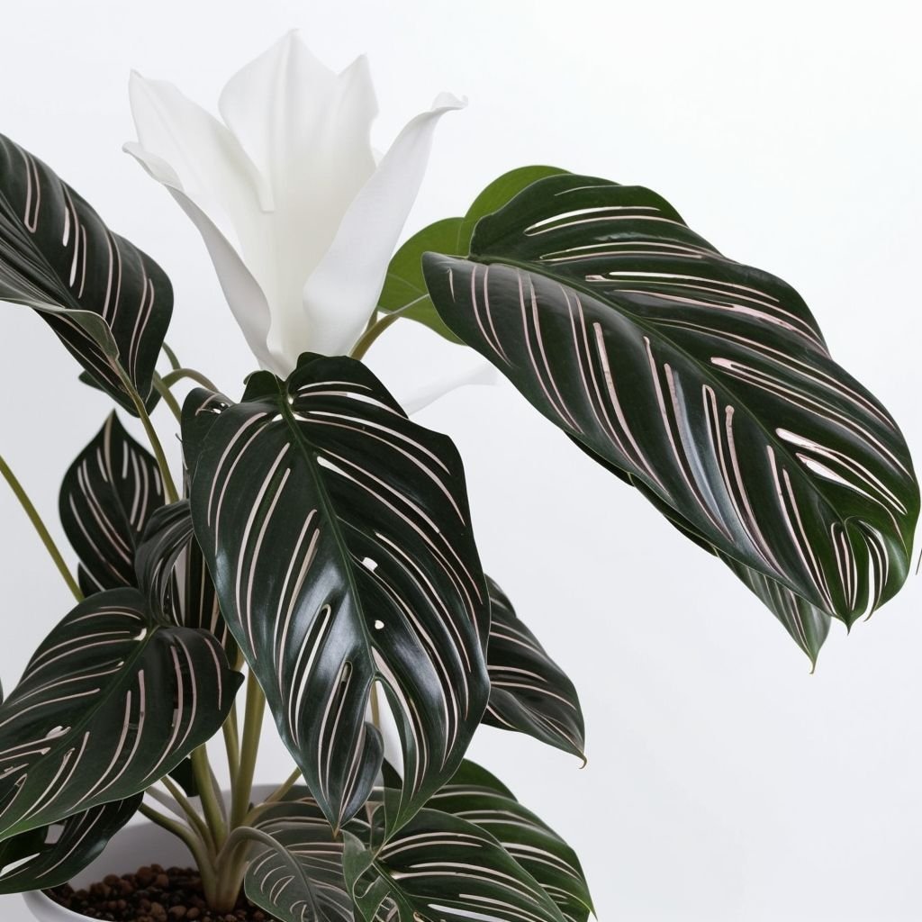 Calathea Sanderiana – należy do rodziny marantowatych. Jej główną zaletą są liście – każdy z nich wydaje się być namalowany ręką artysty, każdy jest niepowtarzalny na swój sposób, a ich odwrotna strona jest pomalowana na intensywny fioletowy kolor. Calathea to roślina lubiąca wilgoć i ciepło, preferująca lekki półcień, nie znosi przeciągów i gwałtownych zmian temperatury. Wymaga obfitego podlewania, szczególnie wiosną i latem – w okresie intensywnego wzrostu i kwitnienia. Roślina ta wymaga częstego zraszania, zimą podlewamy ją rzadziej, ale utrzymujemy ją w temperaturze nie niższej niż 17°C.