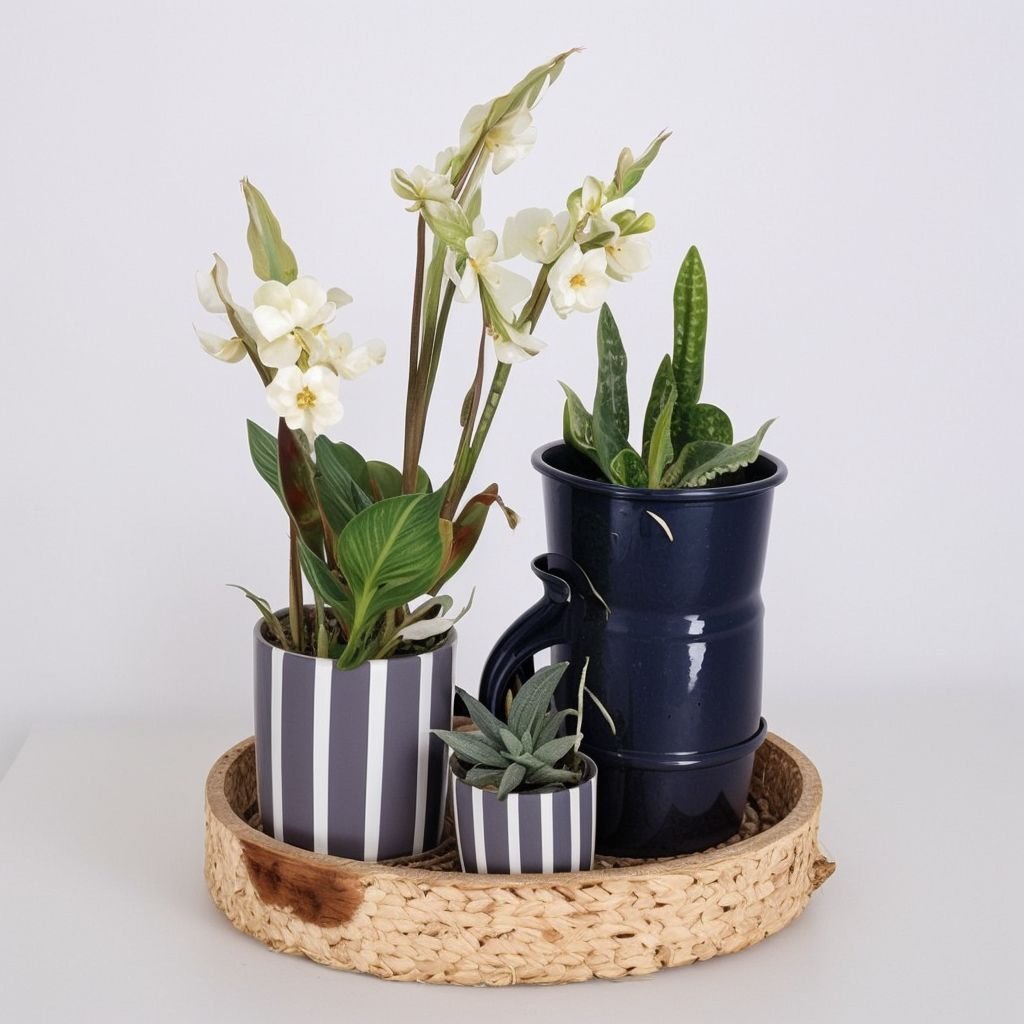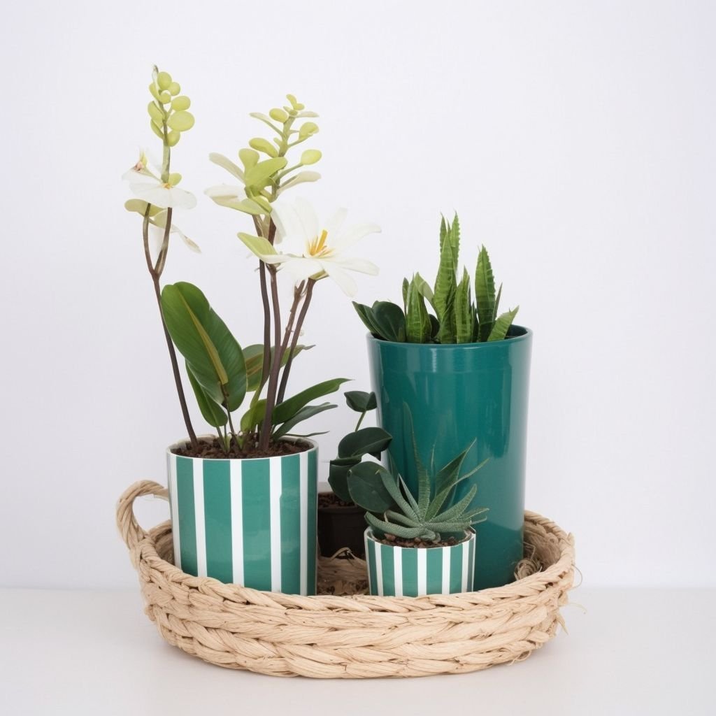 Zestaw roślin „Green Harmony” to wspaniała kompozycja trzech roślin, które idealnie łączą elegancję i naturalne piękno. Zestaw zawiera storczyka, kaktusa i haworcję, z których każda nadaje wnętrzu niepowtarzalny akcent. Rośliny umieszczone są w stylowych ceramicznych donicach umieszczonych na wiklinowym stojaku, co podkreśla ich naturalną elegancję. Zestaw idealnie sprawdzi się w każdym wnętrzu, tworząc atmosferę spokoju i świeżości.